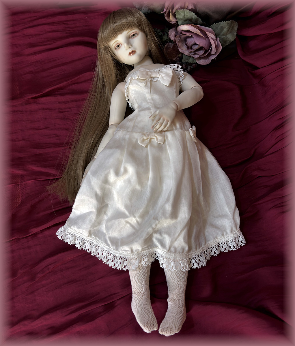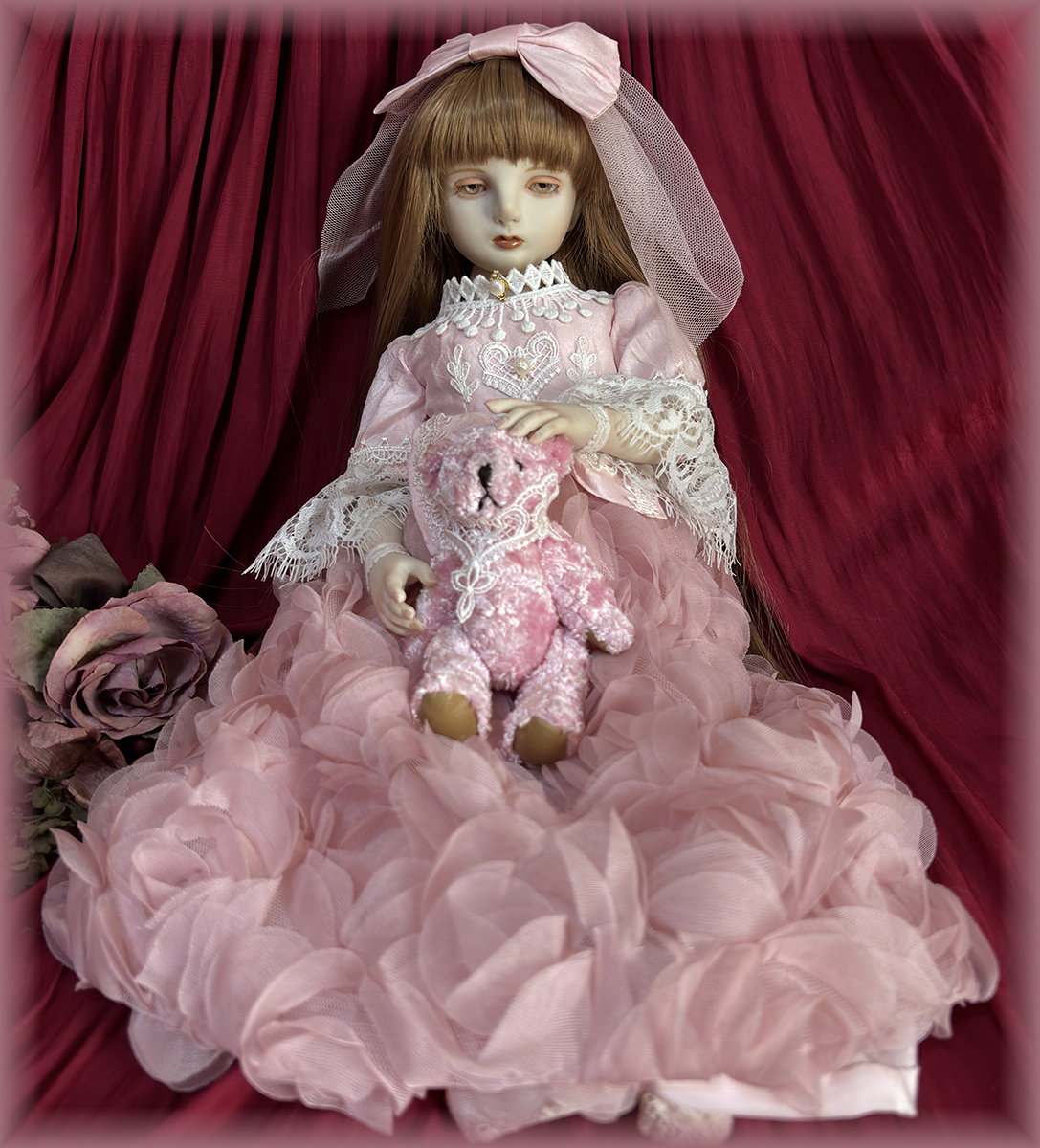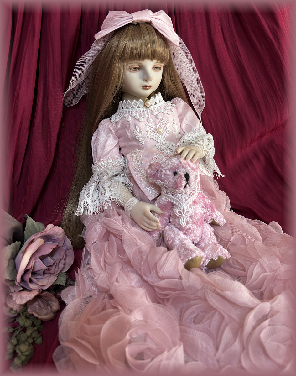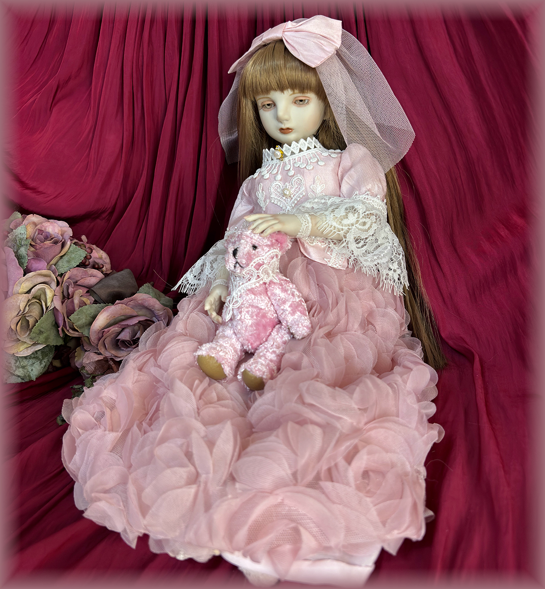 グラスアイ(桜色)、ナイロンウィッグ(髪色:ライトブラウン)