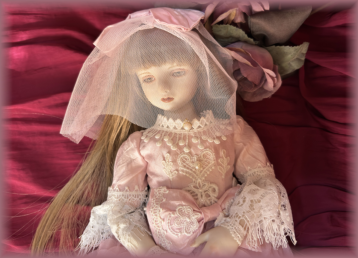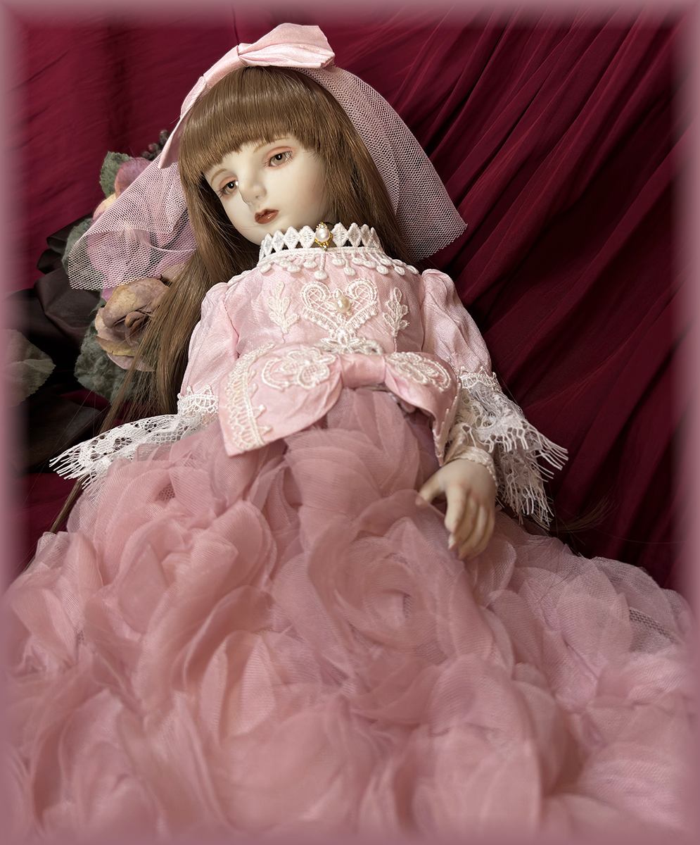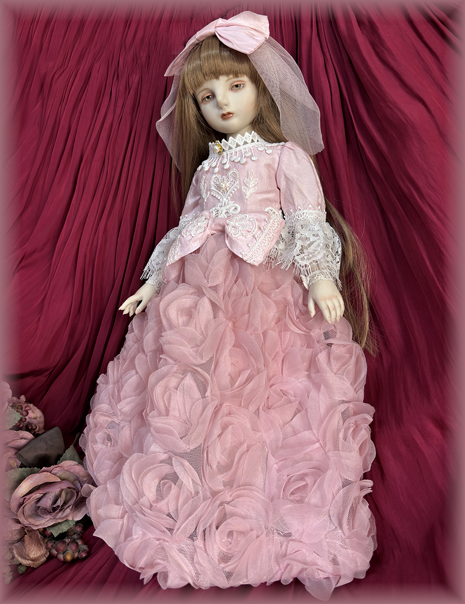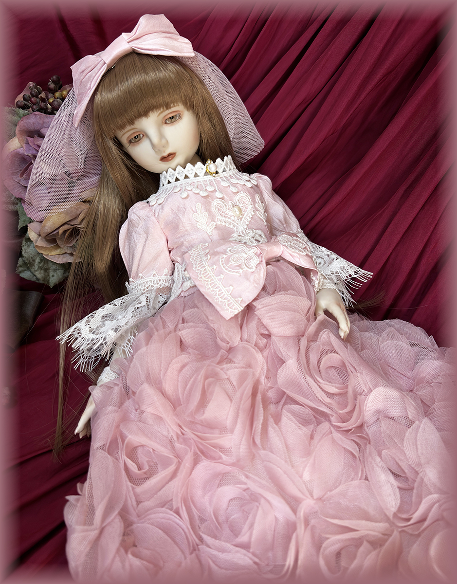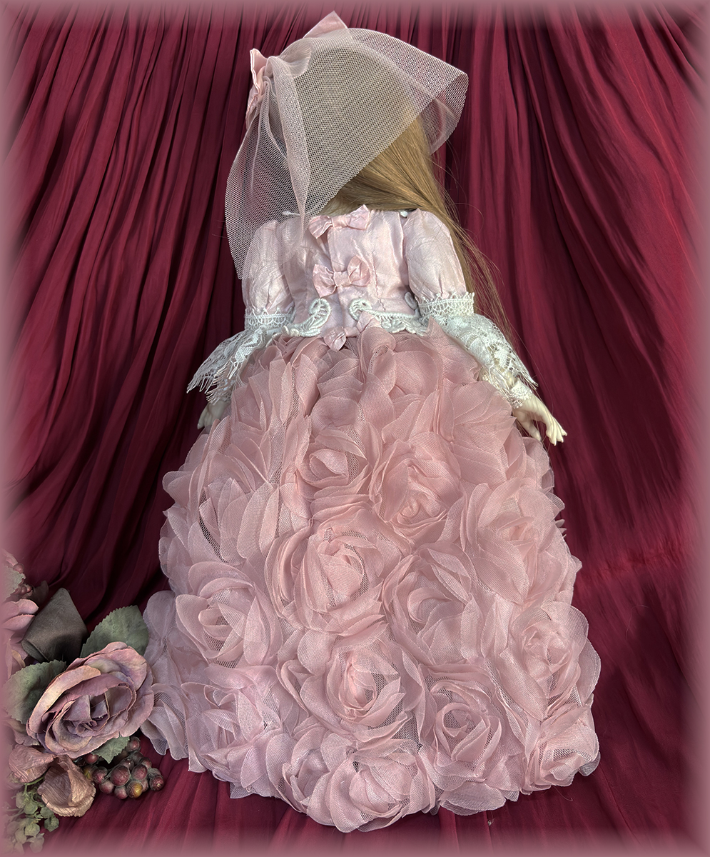 衣装(淡水パールをあしらったピンクのシルク生地と薔薇のチュール生地のドレスと