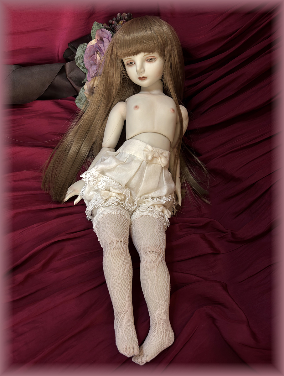 シルクのシュミーズとドロワーズ、薄ピンクのニーハイタイツ、ちびくまのぬいぐるみ