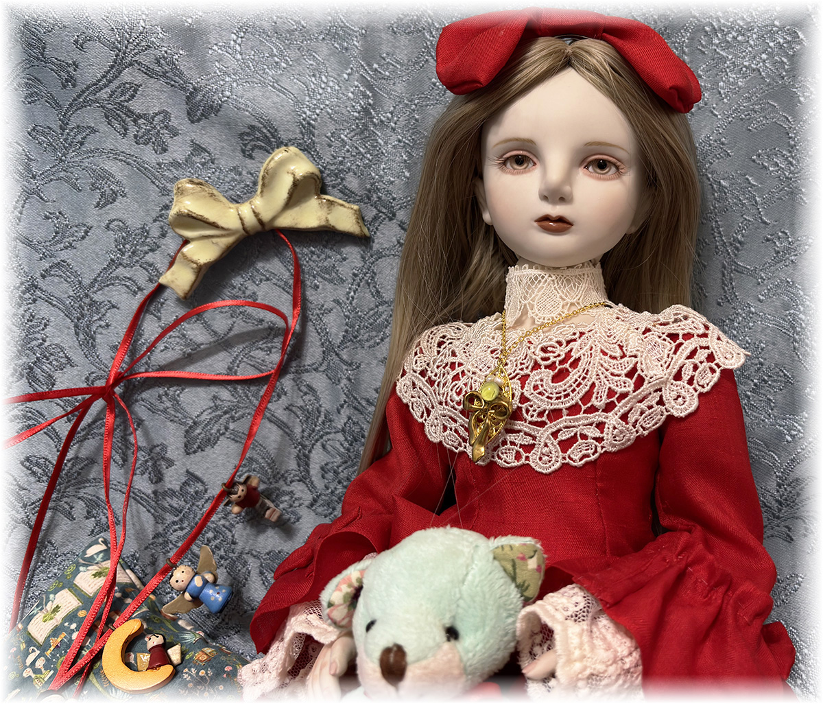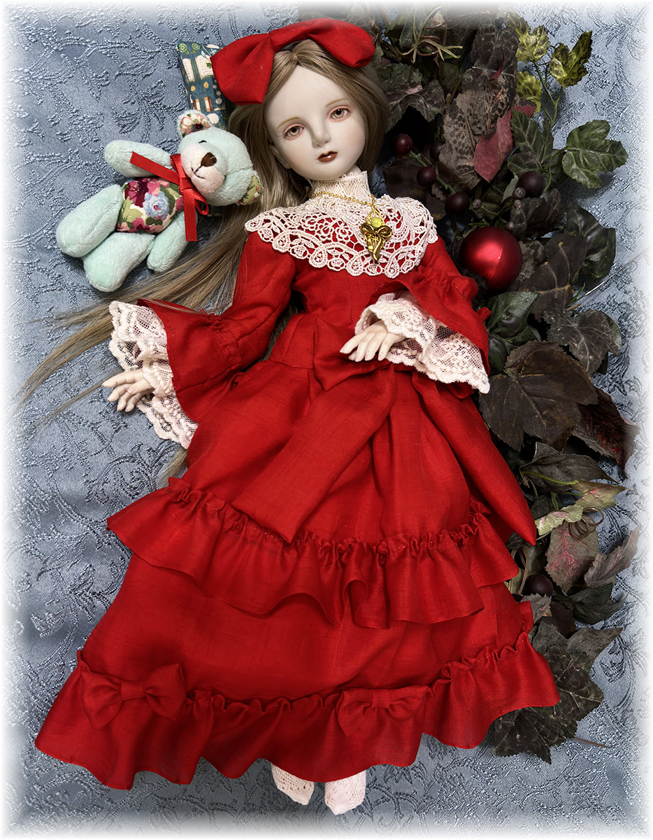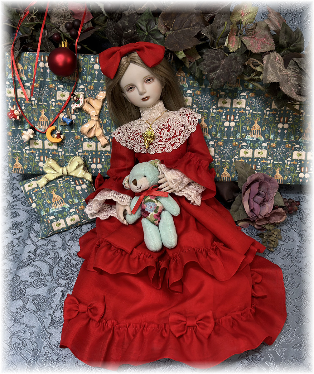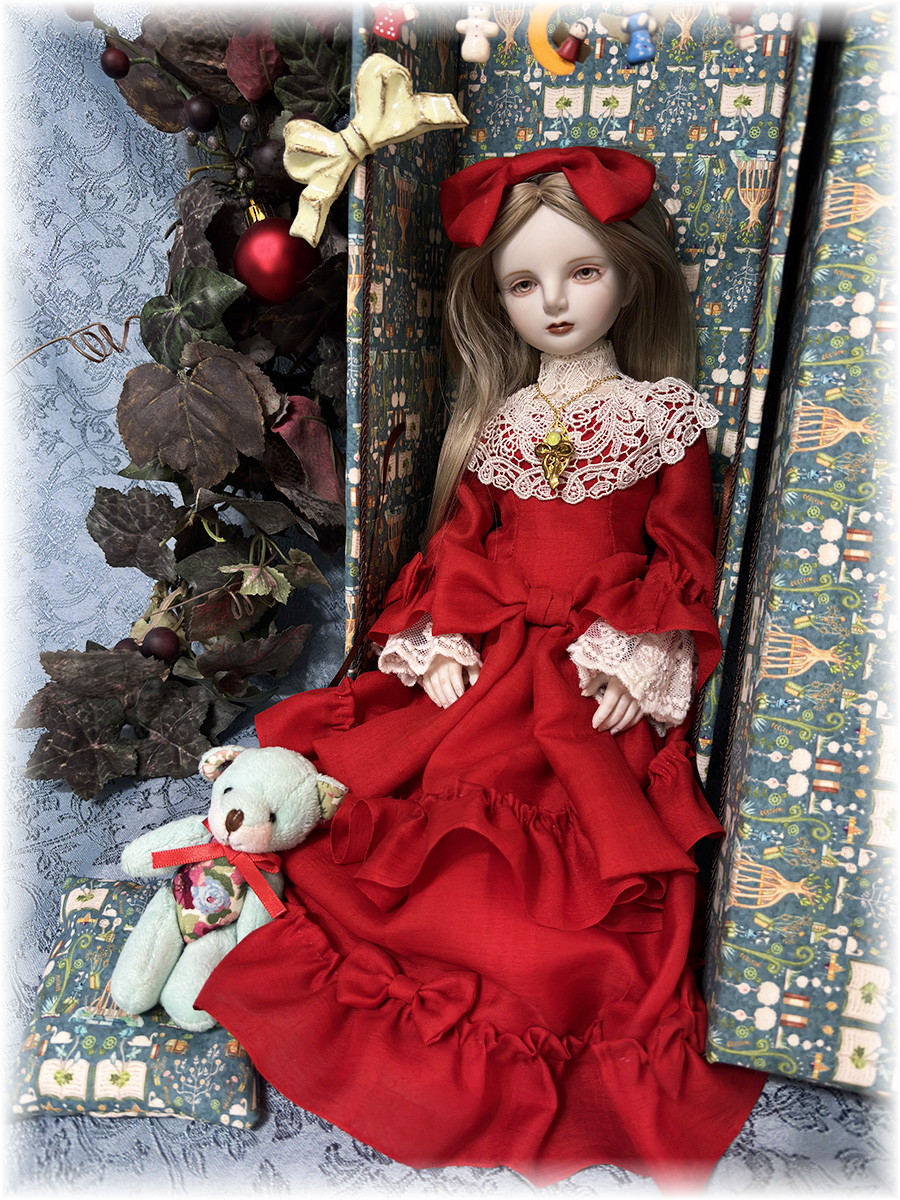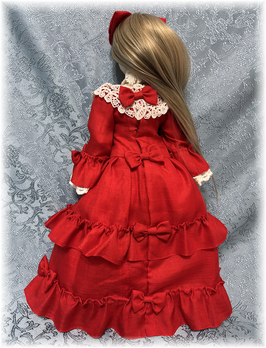 衣装(鮮やかな赤のシルク生地のドレスと髪のリボン(ヘアピン留め)