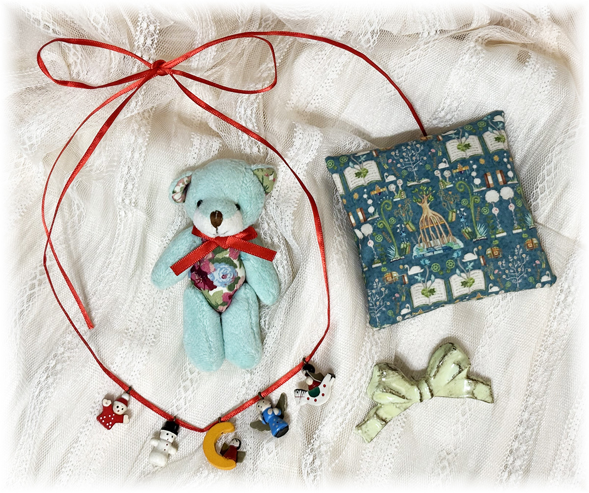 白のニーハイタイツ、ちびくまのぬいぐるみ、小さなクッション、木製のリボン飾り(後ろにピン付き)