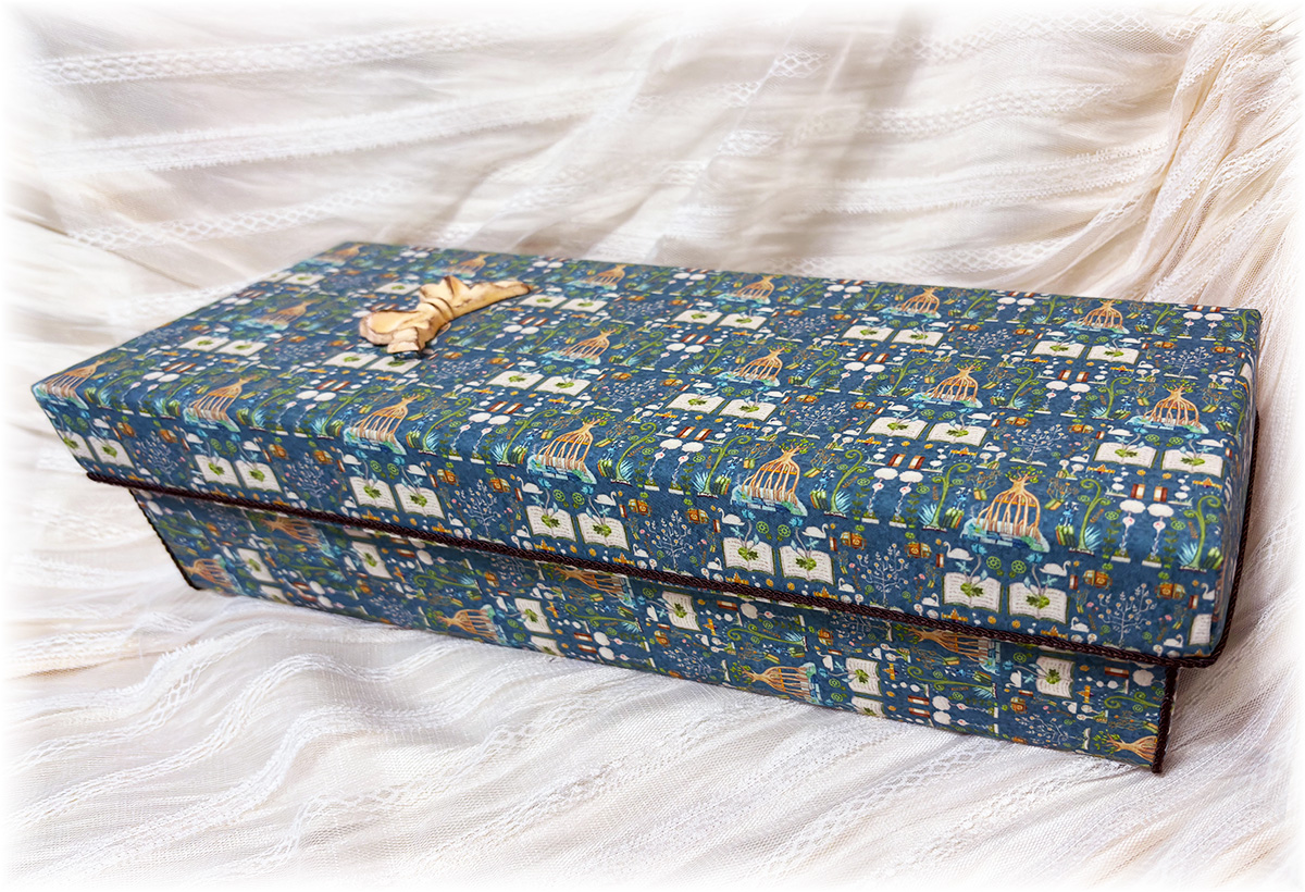 飾り箱は全面布張りで商用可の生地を使用しており立てかけて飾れるよう箱の内側にリボンをつけてあります。