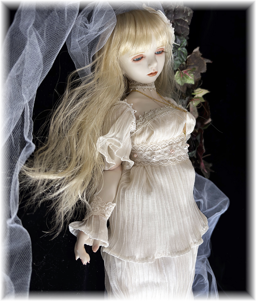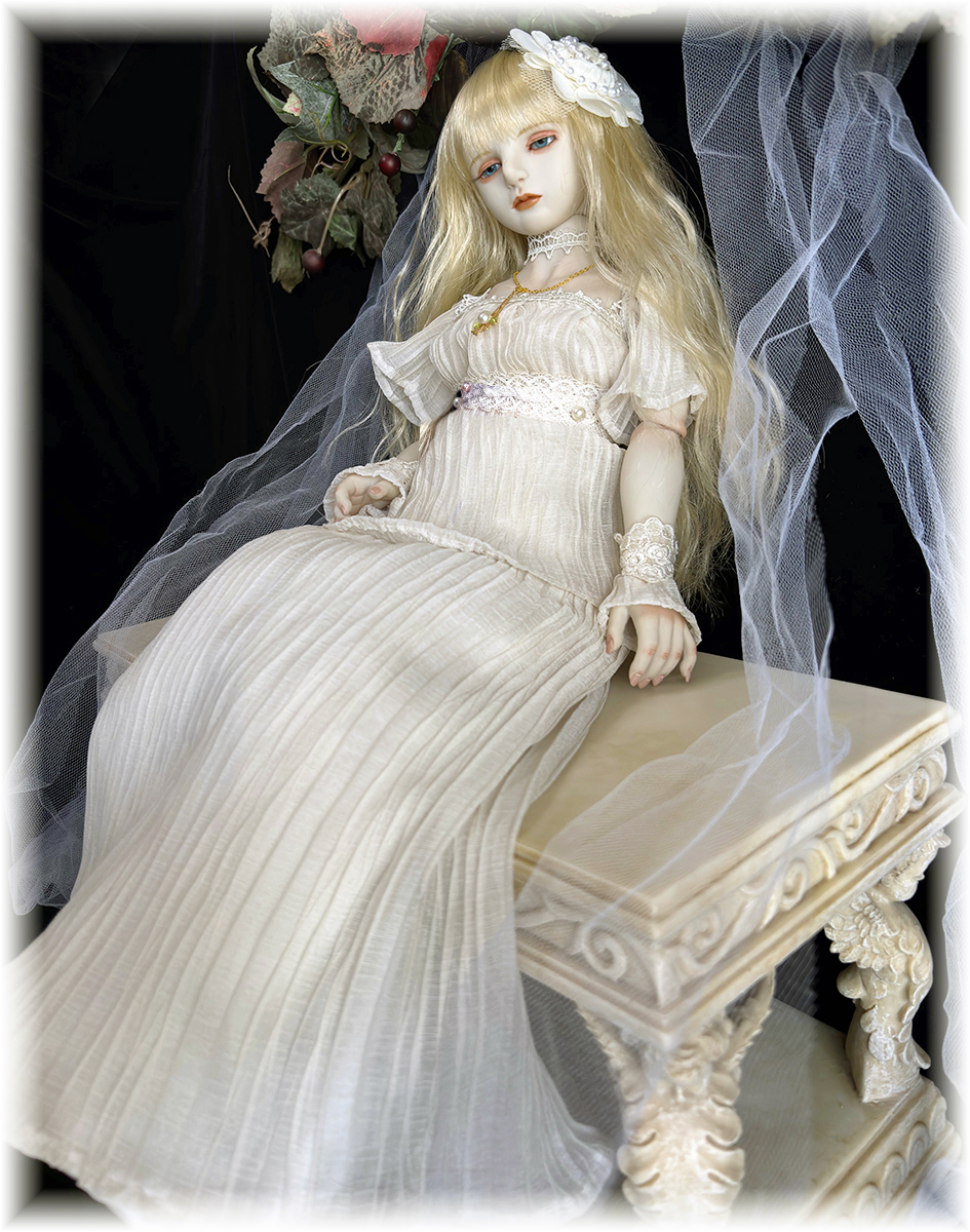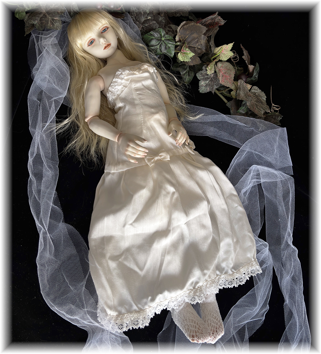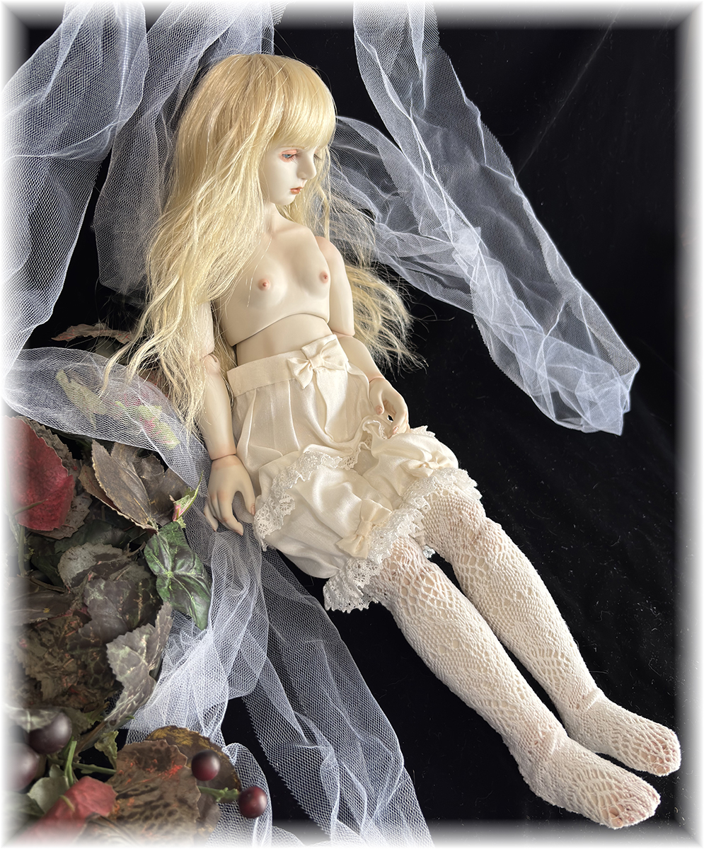 シルクのシュミーズとドロワーズ、スカートのボリュームを出すためのスリップ、白のニーハイ網タイツ