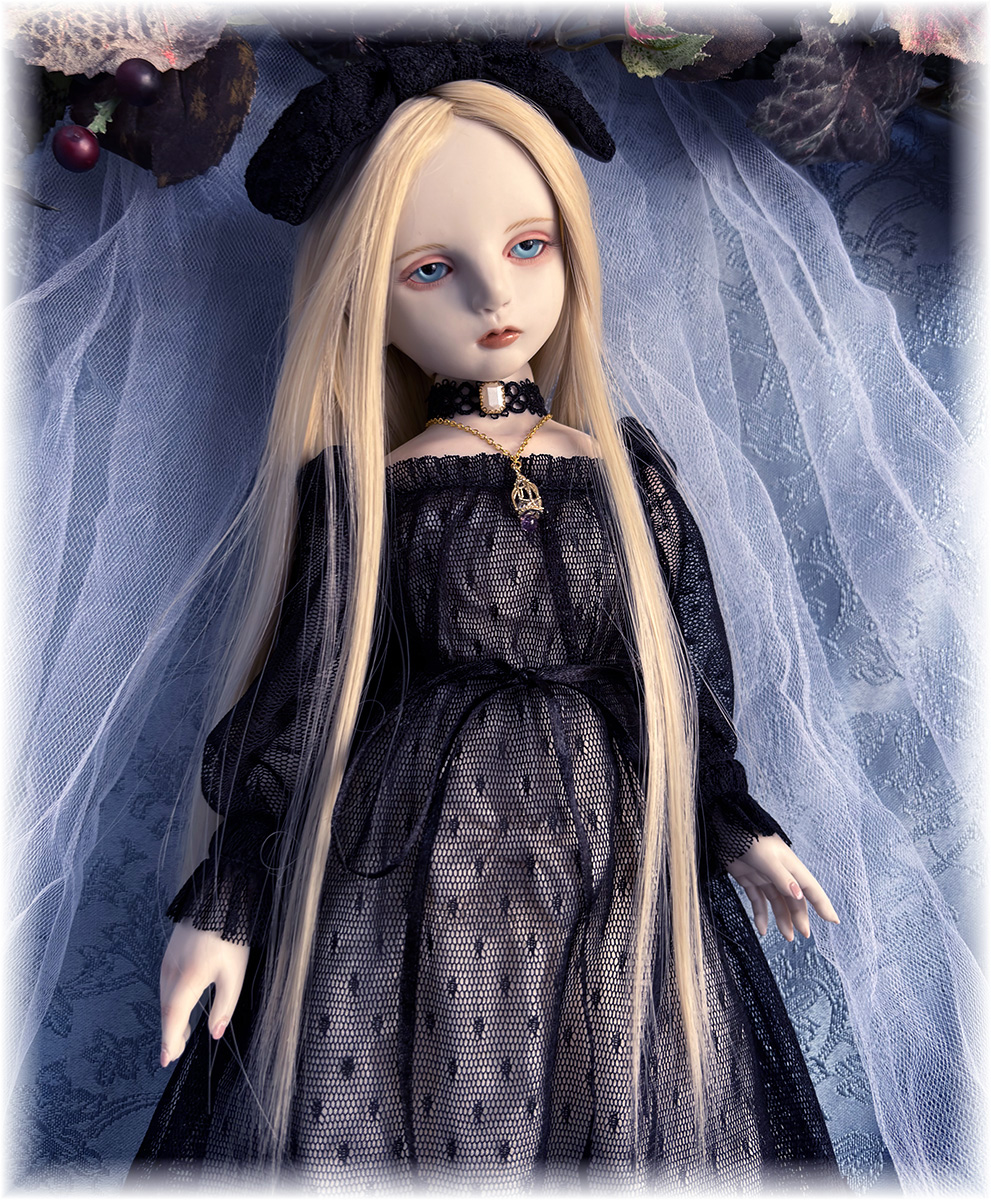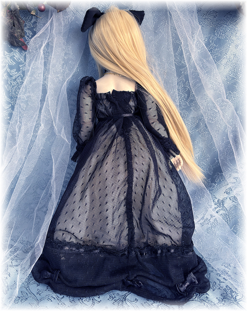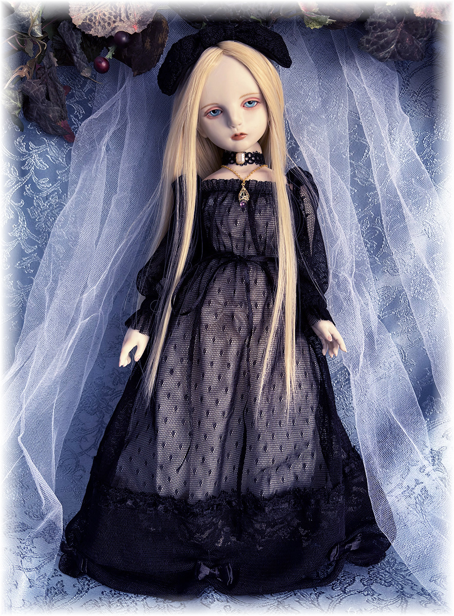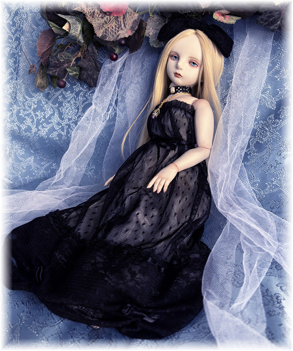 衣装(黒のレース生地のドレスと髪飾り(ヘアピン留め)、ドレスのウエストをしばる黒リボン