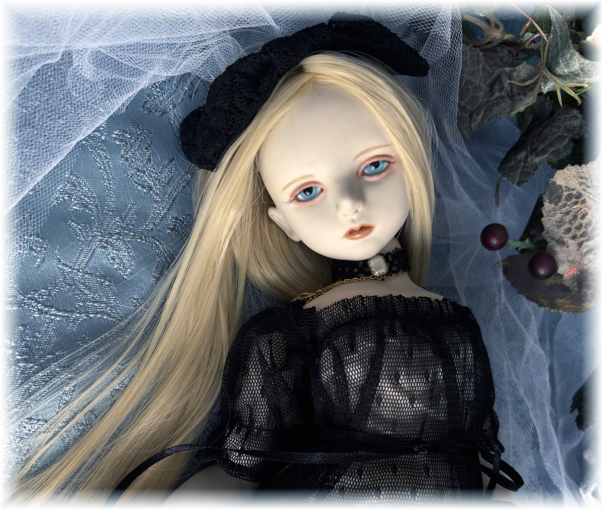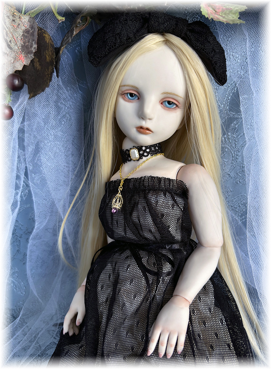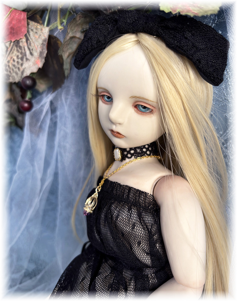 衣装(黒のレース生地のドレスと髪飾り(ヘアピン留め)、ドレスのウエストをしばる黒リボン