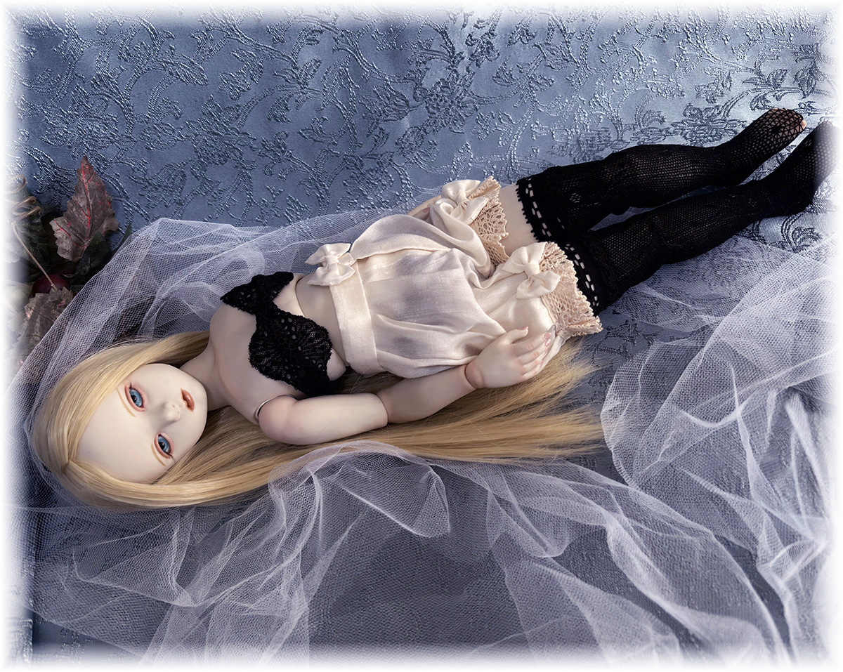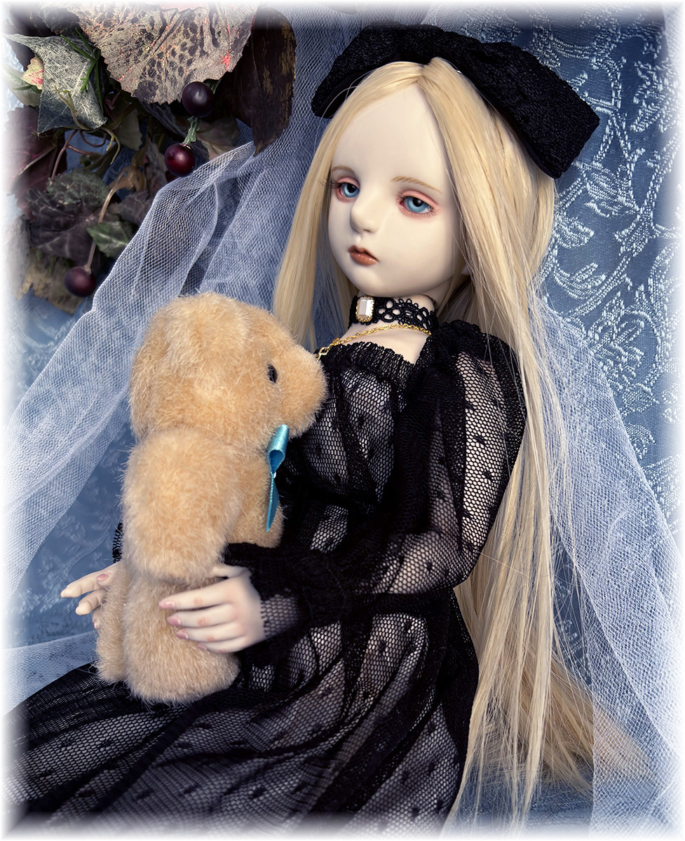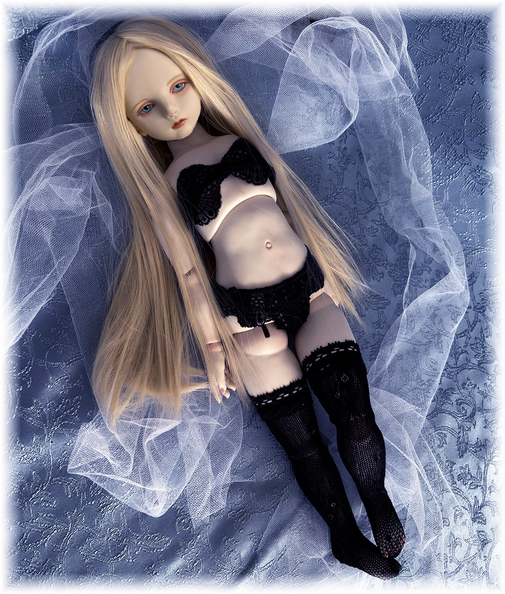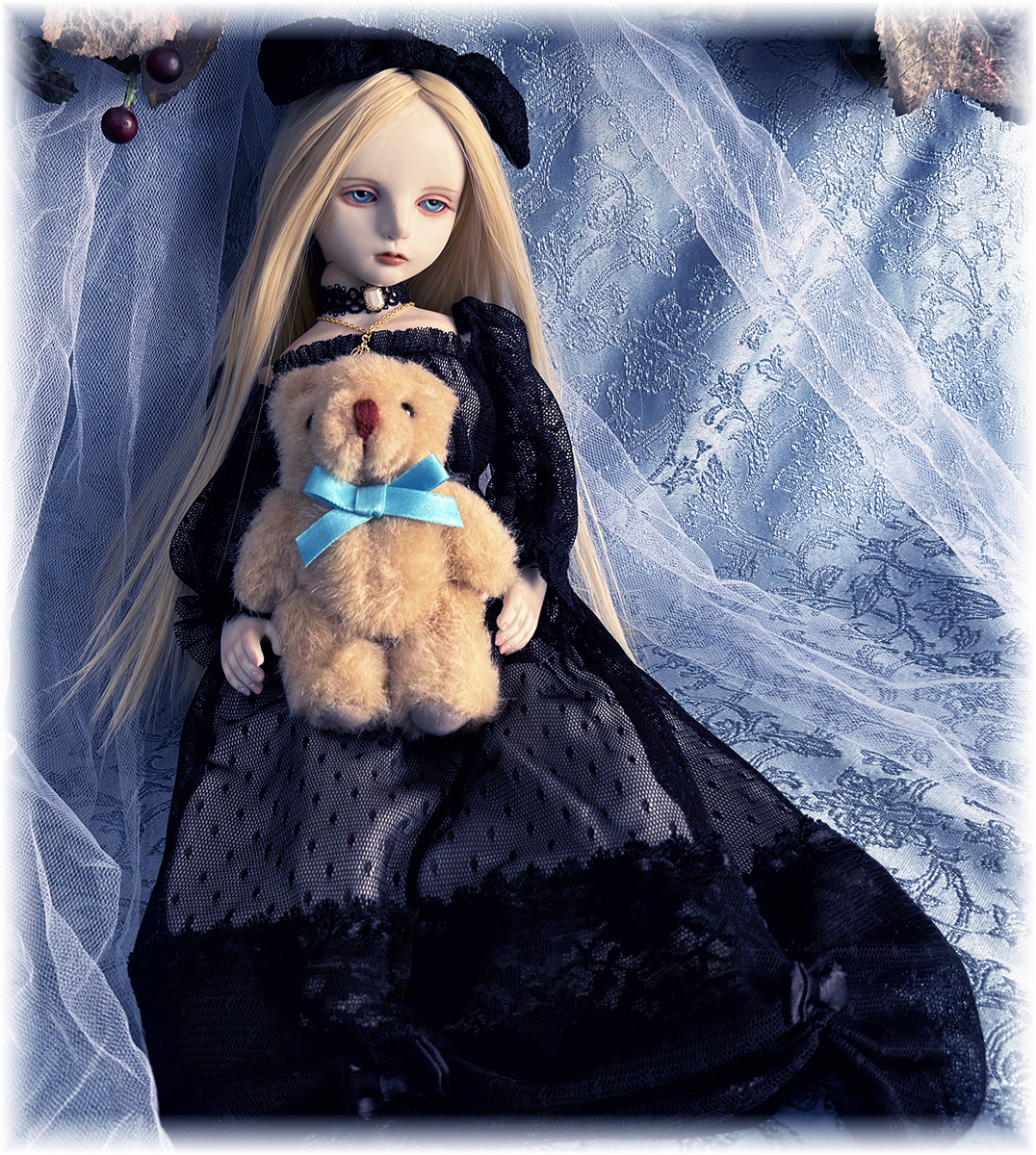黒レースのニーハイタイツ、黒レースのブラジャーとショーツ(ベルクロ留め)、ちびくまのぬいぐるみ